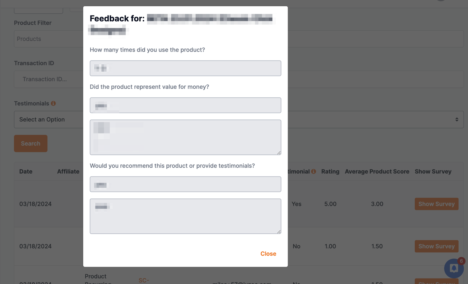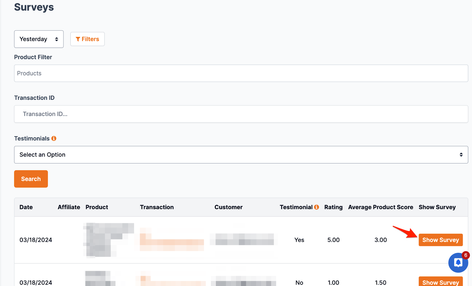 The Customer Survey report defaults to show surveys completed today, but you can change the date range on the report by using the dropdown. You can also filter it by product, transaction id and if the customer is willing to provide a testimonial. We show the date the survey was completed, the affiliate who was credited for the sale, if any, the name of the product, transaction id, customer’s email, if they are willing to give a testimonial or not, the product rating, and the average product score for that product. To see more information about the survey simply click the “Show Survey” button.